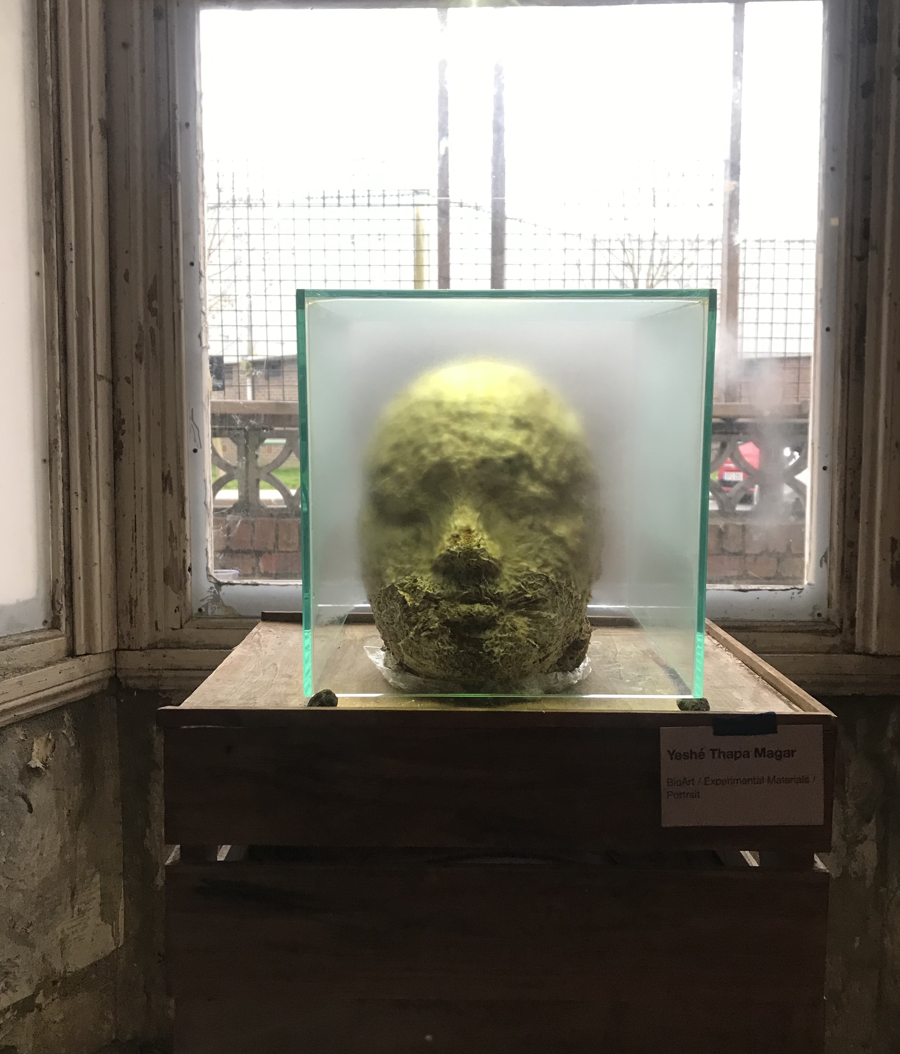 Continuum is a sculpture of the Yeshé’s head, cast from live oyster mushroom mycelium. The piece is the artist’s reflection on the cyclical nature of life and death; understanding and accepting that to maintain ourselves on this planet, we must maintain the net of existence which we are a part of. The sculpture is living and will continue to grow and fruit mushrooms that can/will be harvested and consumed.